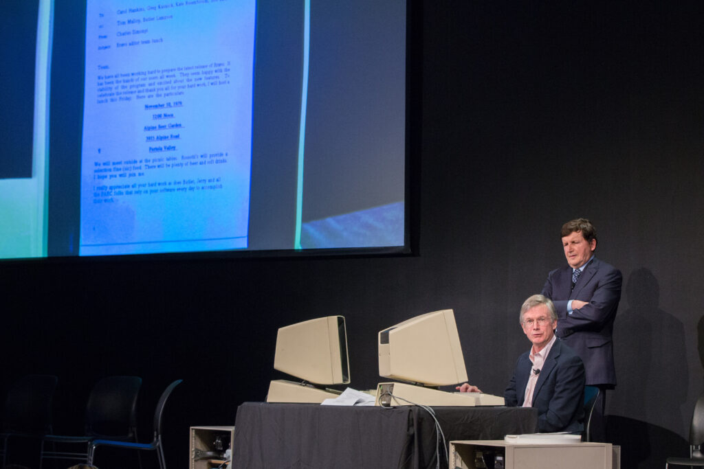 Charles Simonyi (standing) and Tom Malloy demonstrate the Bravo word processor on a restored Alto for a 2017 Computer History Museum event. Courtesy Doug Fairbairn.