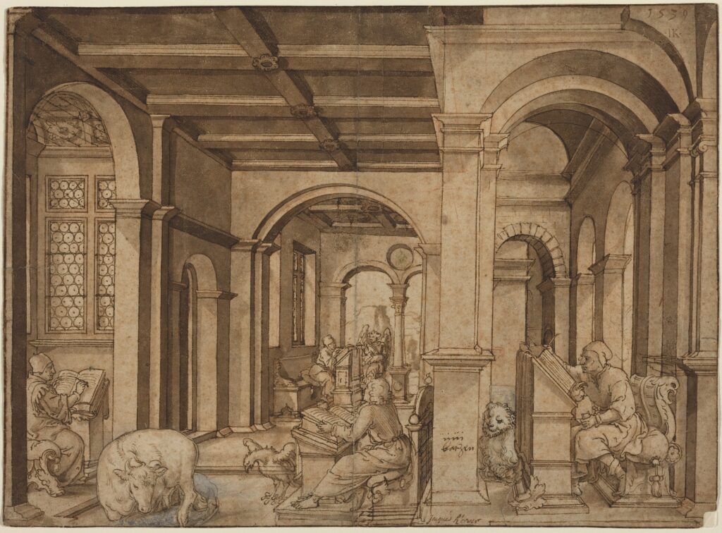 Scriptoria were dedicated spaces for the copying of manuscripts, making this a drawing of a 16th century backup. From the National Gallery of Art. https://www.nga.gov/collection/art-object-page.74850.html