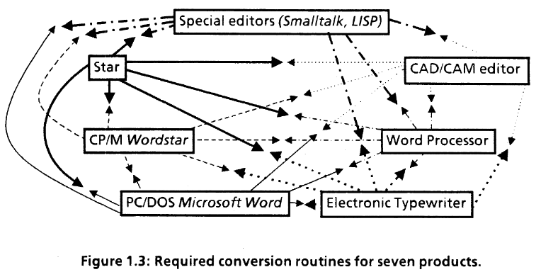 Furthermore, the editors that were emerging in the first half of the 1980s ran from the rudimentary to the elaborate. This spread of editor functions was itself another challenge. How could an interchange format work from the simplest to most complex editors? How could simple editors just work on the parts of a document that they could, but leave everything else alone?
