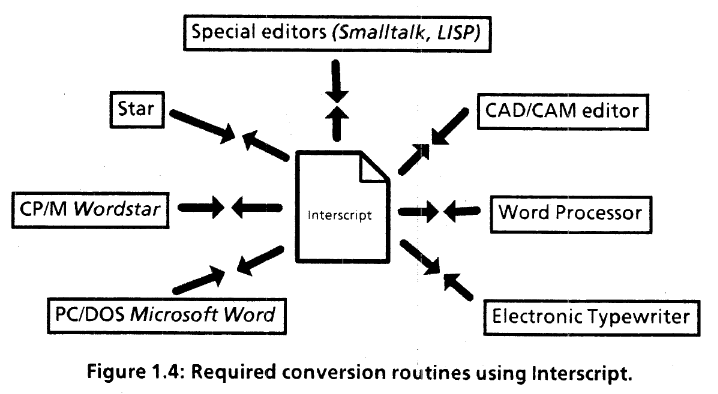 The promise of Interscript, in two figures from a 1985 Xerox document. https://bitsavers.org/pdf/xerox/interscript/IntroductionToInterscript.pdf