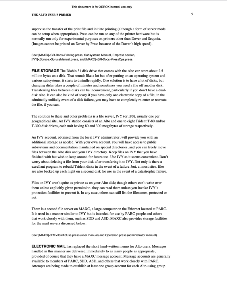 The nearly one hundred and fifty thousand unique files —around four gigabytes of information—in the archive cover an astonishing landscape: programming languages; graphics; printing and typography; mathematics; networking; databases; file systems; electronic mail; servers; voice; artificial intelligence; hardware design; integrated circuit design tools and simulators; and additions to the Alto archive. All of this is open for you to explore today at https://info.computerhistory.org/xerox-parc-archive Explore!