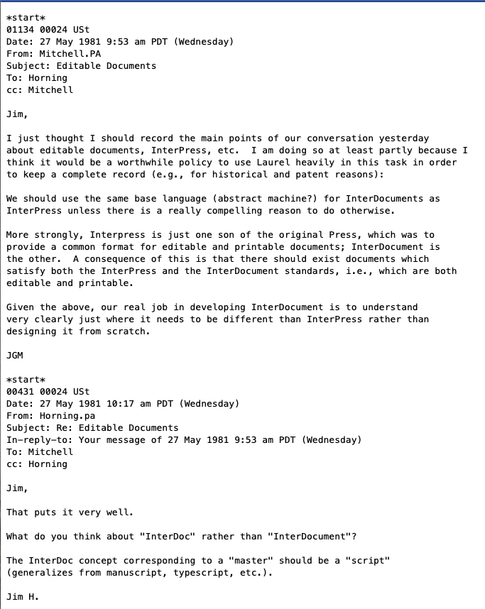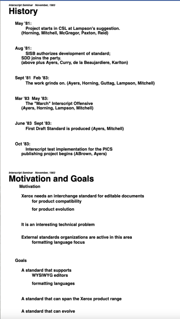 The Interscript effort, as electronic mail held in the archive show, really took off in 1981 as the success of Interpress became clear. Spurred by Butler Lampson and Jim Mitchell, the project also included Brian Reid, who had worked with Lampson on Interpress, as well as Bob Ayers and Jim Horning, who worked especially closely with Mitchell. The Interscript project ran from 1981 into at least early 1984.