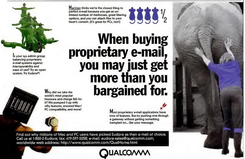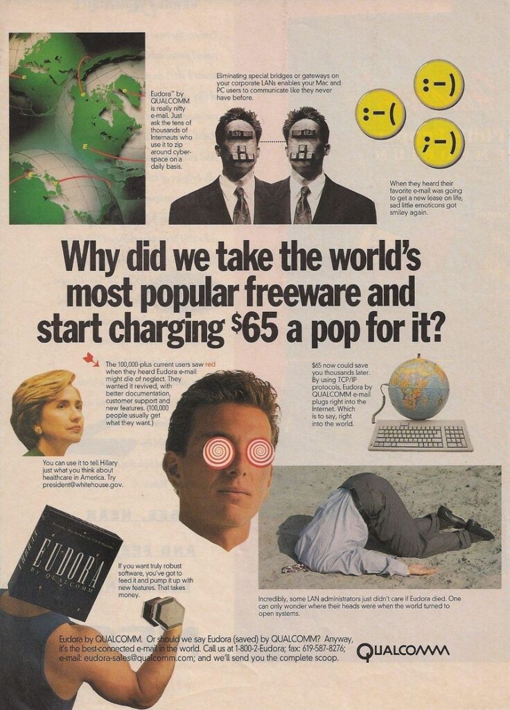 It’s hard to overstate Eudora’s popularity in the mid-1990s. The April 22, 1996 InfoWorld article announcing the release of Eudora Pro 2.0 called it Qualcomm’s “best-selling product,” and said that “according to International Data Corp. (IDC), Qualcomm claimed 64.7 percent of all e-mail software revenues in 1995.” A later exhibit about Eudora in Qualcomm’s company museum observed that “By 1996 Eudora had 18 million users, making it the world’s most widely used internet email software at the time.”