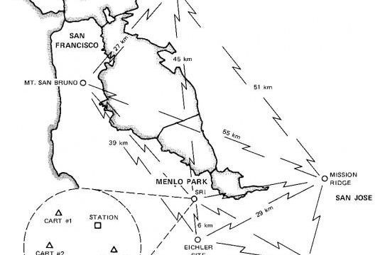 The packet radio van might have looked lonely as it cruised Bay Area streets in November of 1977. But it was part of a carefully planned international effort involving more more than 35 people and eight institutions. The figure below shows the path taken by the test packets.