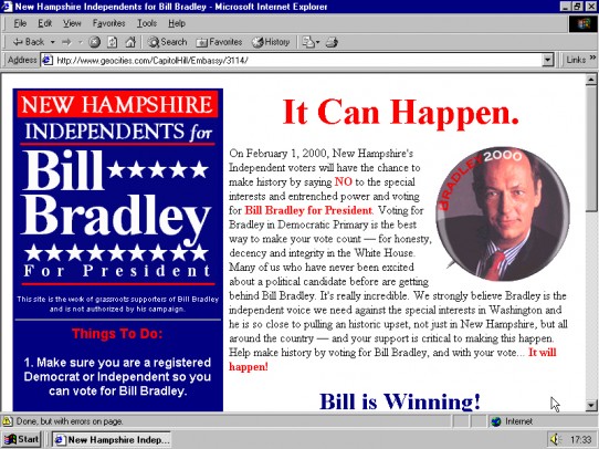 Although email played a role in the ’92 US presidential campaign, by 2000 the web had become a new mass medium, complete with ads. CapitolHill was the place for all things political.