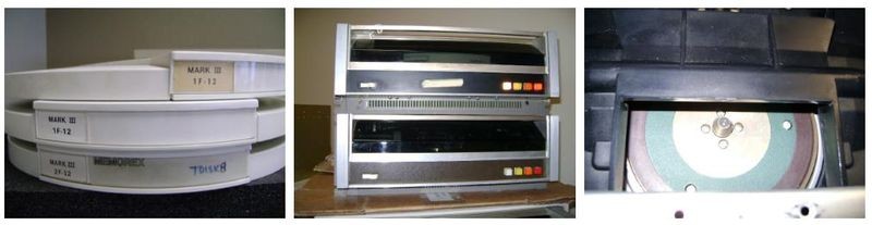 Left to right: Two Alto disk drives, disk packs, and Interior shot of the disk.