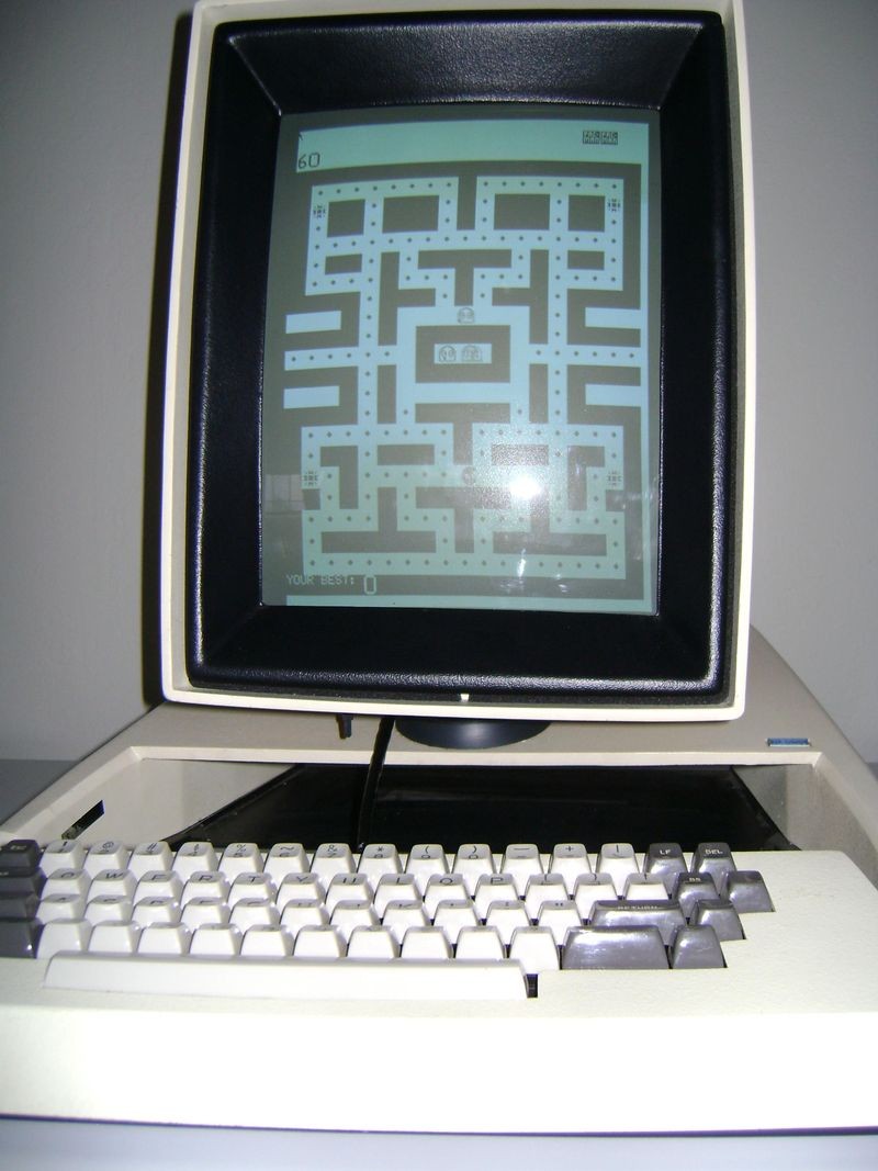 A restored screen and keyboard showing a Pac-Man program. The screen measures 8 ½ x 11 inches.