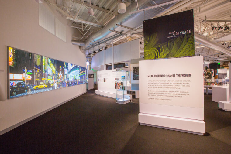 Make Software explores the history, impact, and technology behind seven game-changing applications: MP3, Photoshop, MRI, Car Crash Simulation, Wikipedia, Texting, and World of Warcraft. The Stata Family Foundation Software Lab is at the center of the exhibition, where visitors are introduced to basic programming concepts and encouraged to try coding hands-on.