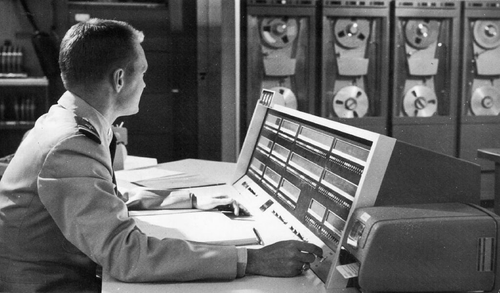 Lt Harry Nicholson at a 1604 console. Capt. Nicolson served as Commanding Officer of FNOC from 1982- 86. Source: Calhoun: The NPS Institutional Archive