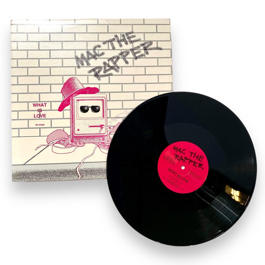 “What is love?,” Mac the Rapper, performed by the Apple Macintosh, Shinola Records, 1987, catalog number 102651542. You can listen to it here.