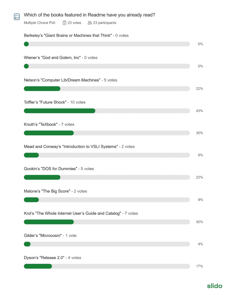 The enthusiastic audience shared their favorite books about computers and computing, with the clear winner being Soul of a New Machine by Tracy Kidder, published in 1981. They also reported what books featured in McCray’s ReadMe they had read. See the results below.